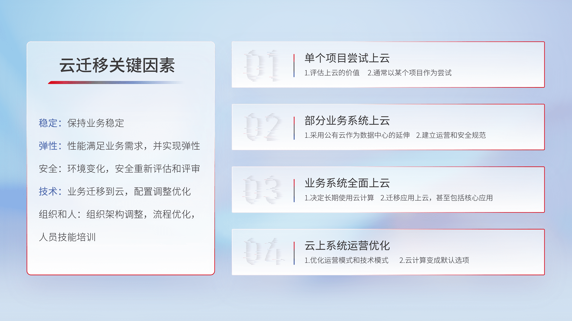 结合实际业务,,,,从规划设计、、、、云平台选型、、、云原生改造、、、、数据迁移、、集成交付,,,,迁移全过程为客户识别最佳上云路径,,做好风险识别管理,,,,设计网络架构、、、身份权限、、、安全审计合规、、、操作审计、、、日志审计、、、监控告警策略、、、多站点容灾设计等,,,对云上基础设施进行整体规划,,,提升IT治理水平,,以满足弹性、、、、高可用、、、高性能的需求。。。