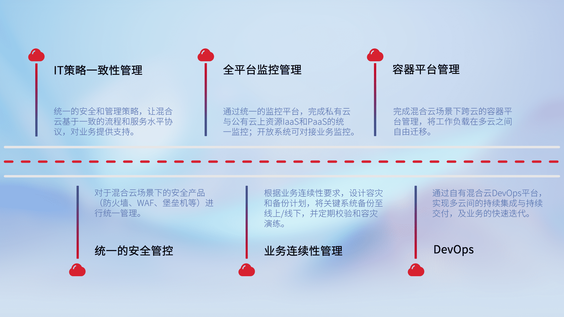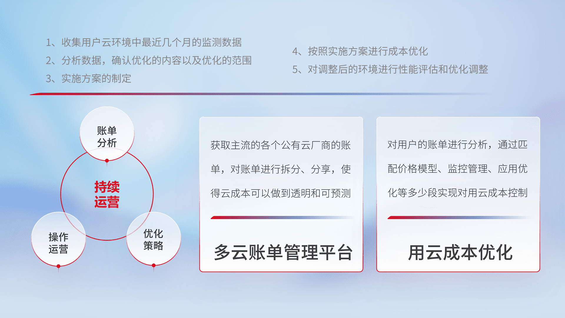 通过多云纳管,,,以统一的资源数据模型把客户的云资源进行抽象和封装,,,,进而实现对多云资源的统一操作,,保障云资源管理的可靠性、、、稳定性与可用性。。。量身定制化运维内容,,,配置、、、、开发运维、、、、补丁管理、、、备份、、、、监控、、、、认证和访问管理、、审计和日常巡检等,,保障在用云过程中的可靠度,,,稳定度以及高可用率。。。。